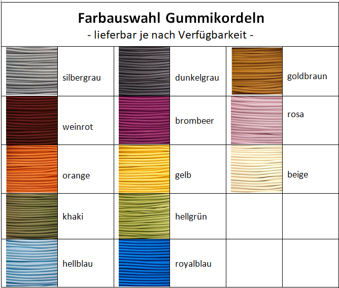 GUMMIBÄNDER / KORDELN werden entsprechend deiner Wunschfilzfarbe passend dazu abgestimmt. Ich wähle jeweils 2-4 Farben nach Verfügbarkeit (siehe Foto mit Gummikordeln). Du kannst natürlich gerne deine eigenen Farben lt. Farbkarte auswählen und somit deine Pinnwand individuell gestalten. Teile mir deine Farbwünsche bitte bei der Bestellung mit.